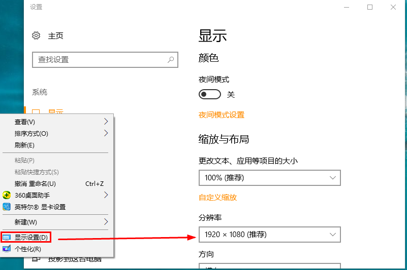 第一步:调整分辨率,在桌面单击鼠标右键,选择【显示设置】,调成1920*1080等通用性较强的分辨率。