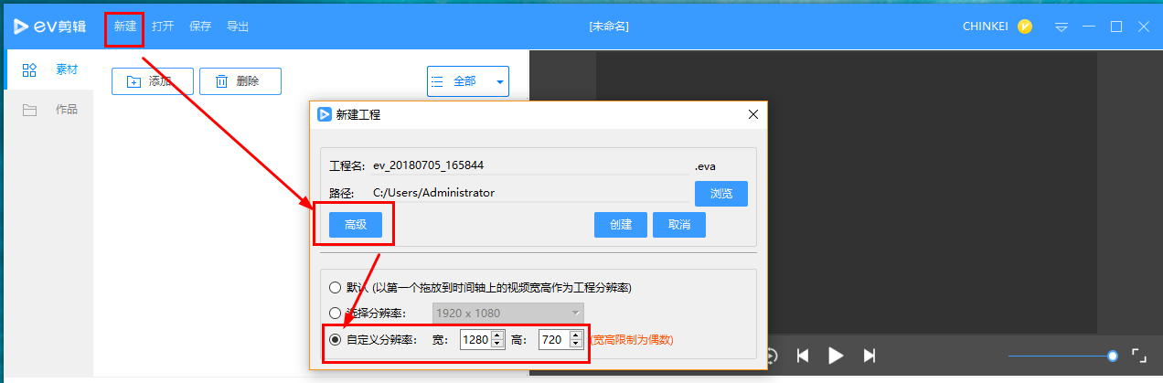 第二步:点击【新建】,选择不保存。点选【高级】,通过自定义分辨率输入上一步的数值即可。再通过双击视频轨道的素材,点击【画面裁剪】黄色线框调整到合适的位置。