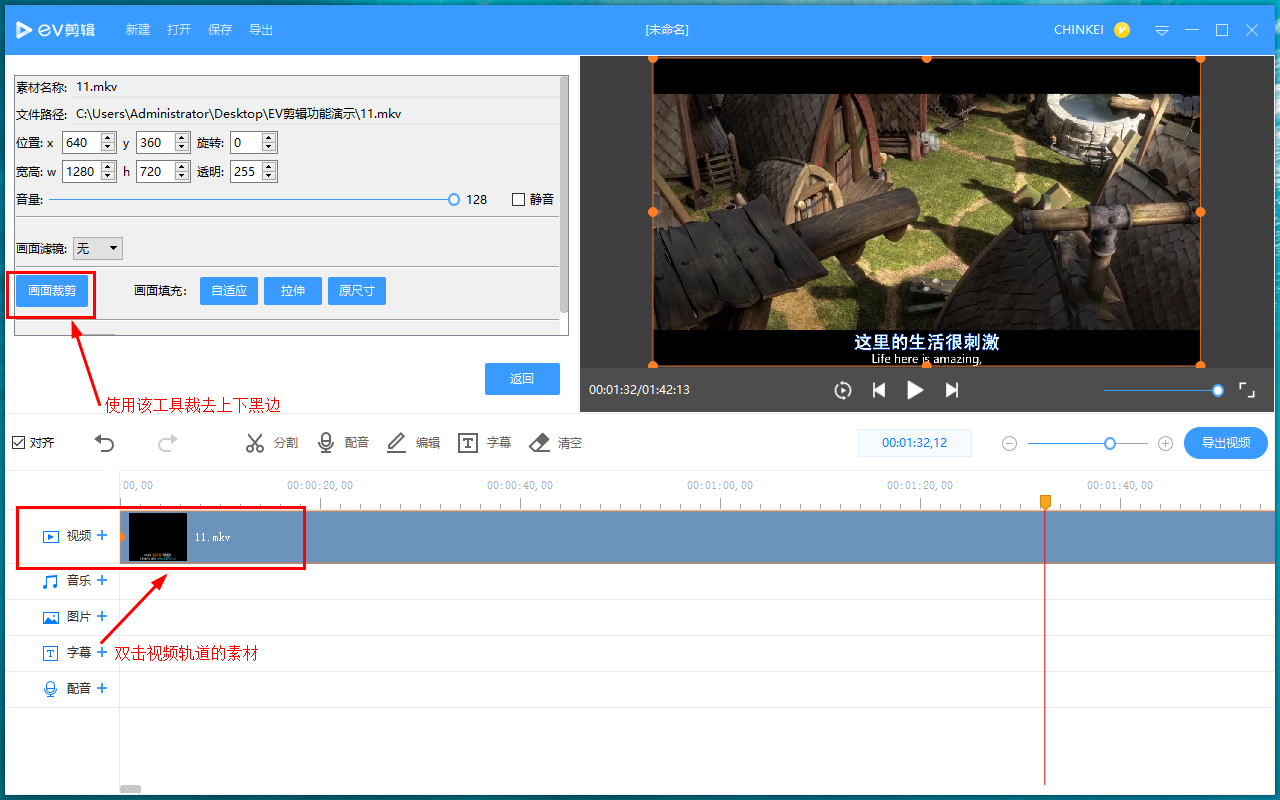 视频画面具有上下黑边,影响观看效果。要想去除视频上下黑边可以通过EV剪辑软件两步达到效果。