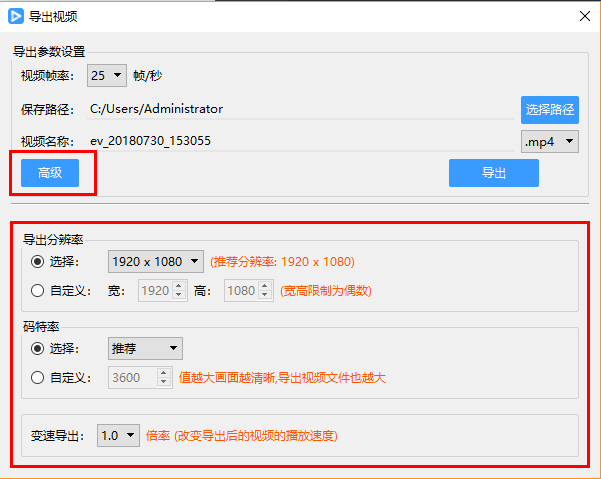 剪辑好的视频导出时可以通过【高级】选项,自定义导出视频分辨率、码特率、以及变速导出的数值。如下图所示: