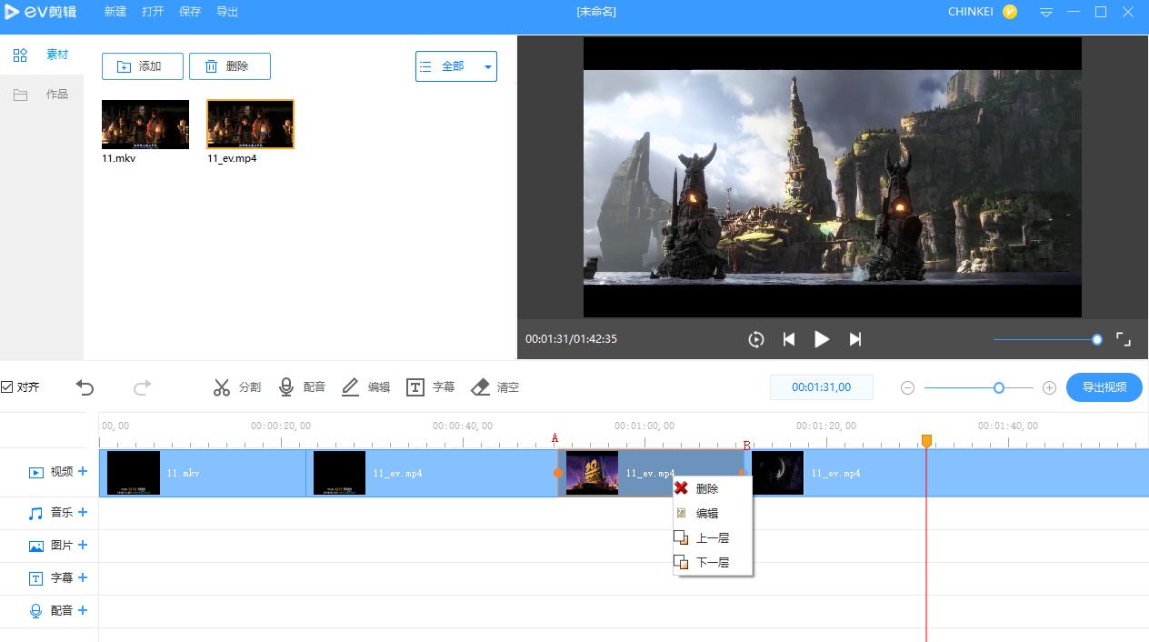 EV剪辑 / PC版 / 常见问题 / 操作相关 / 如何在剪辑中合并两段视频 <<返回列表