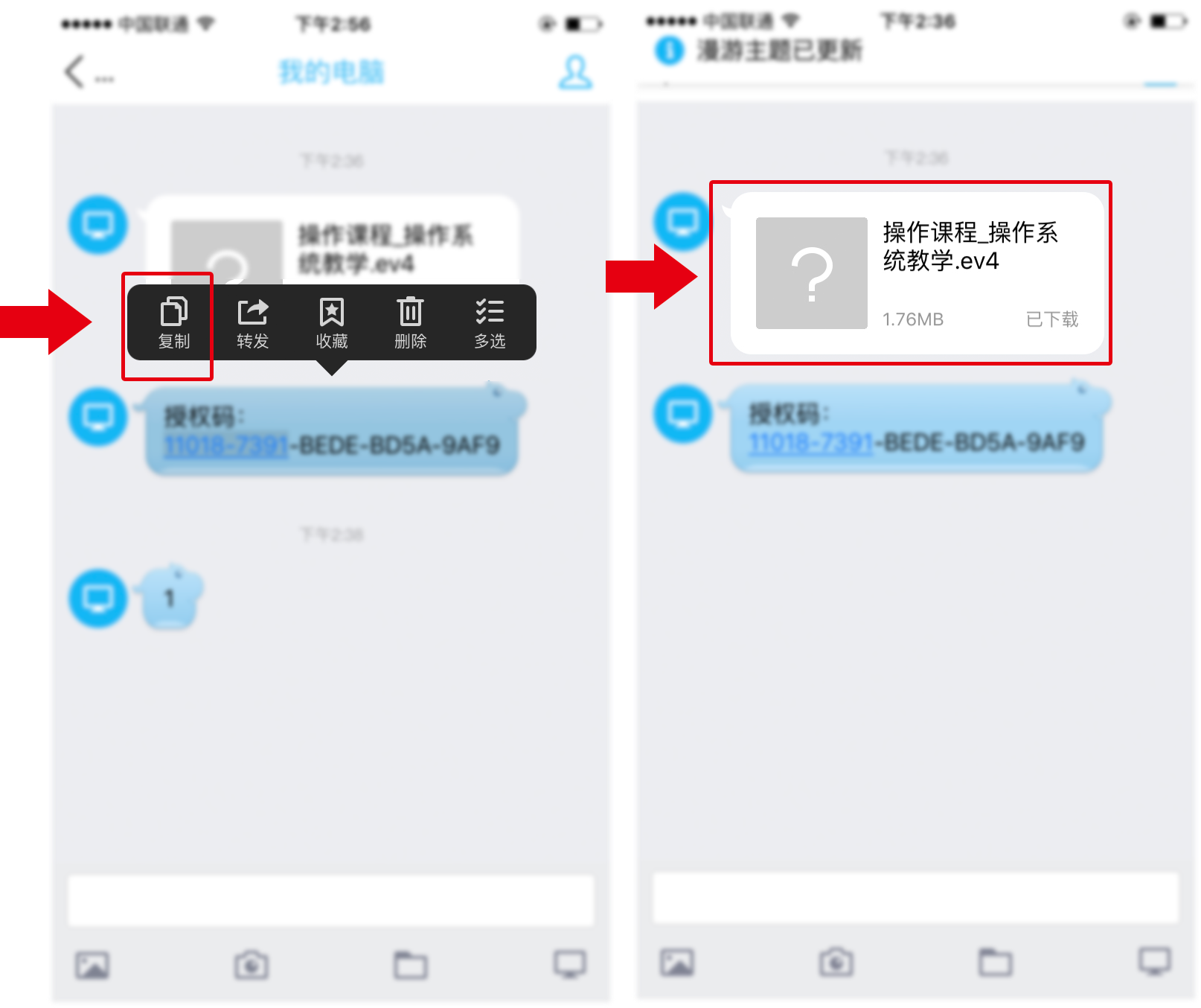 1、 长按复制你收到的授权码,然后打开收到的对应ev4格式视频。