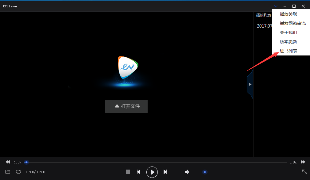 一、首先,打开EVplayer,点击右上角弹出证书列表。