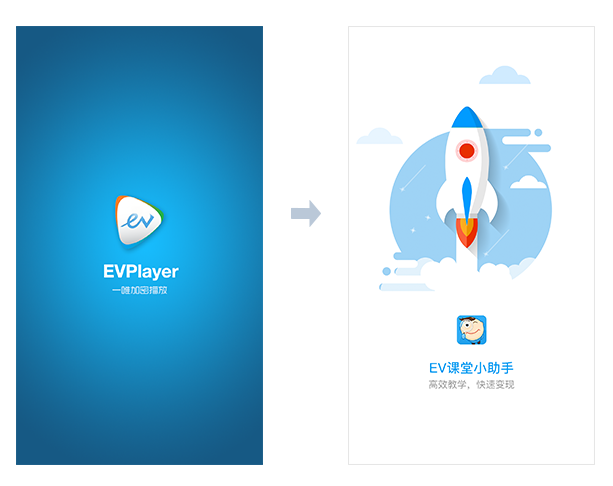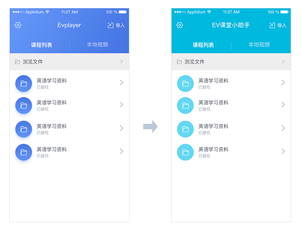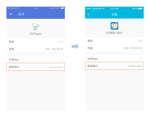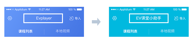 1、名称修改:定制播放器名称包括,首页导航栏名称。如下图所示,由EVPlayer变为EV课堂小助手,同时手机上的APP名称也会同步修改。