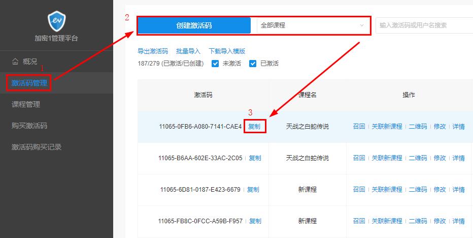 生成ev4格式要给学员观看,必须通过激活码,在商户后台创建激活码时每选择一门课程生成一个码时扣除1元,但一门课程下可以放置任意数量视频,不做限制。 生成以后,会出现在下图空白区域,点击复制分发给学员即可。